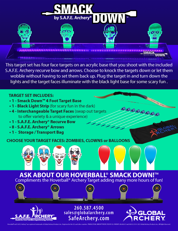 This target set has four face targets on an acrylic base that you shoot with the included S.A.F.E. Archery® Recurve Bow and Arrows. Choose to knock the targets down or let them wobble without having to set them back up. Plug the target in and turn down the lights and the target faces illuminate with the black light base for some scary fun.